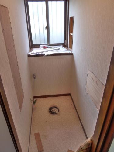 壁のクロスと床のクッションフロアを貼り替えてリフォーム用の排水管部材を取付します。